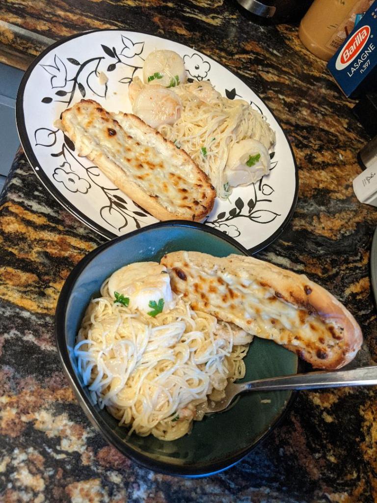 - Add in the cooked pasta, scallops, and parm to the shrimp an sauce, ensuring everything is evenly coated