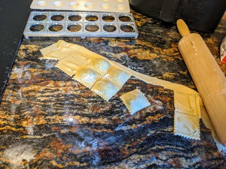 - Carefully remove the trimmings from the edges and delicately remove each ravioli from it’s section, placing it onto a floured baking sheet