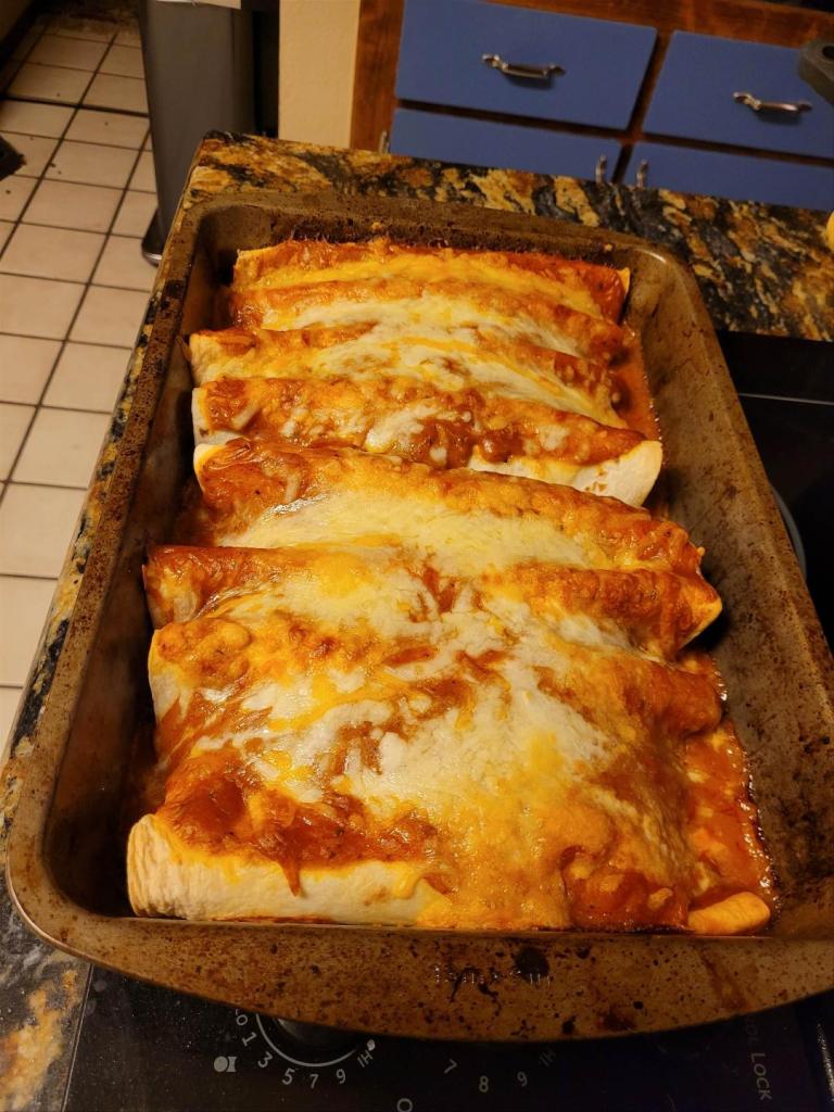 - To assemble the enchiladas, place roughly 1/2 cup of the veggie / bean / cheese mix into a tortilla and wrap it snugly, then place it on the pan with the seam side facing down