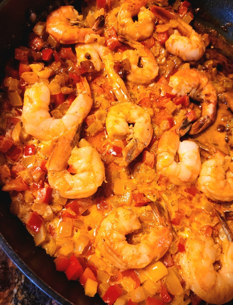 - Add the shimp on top of the veggies and allow to cook until pink, about 2-3 minutes